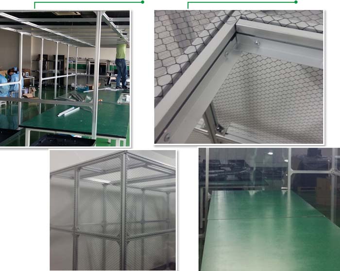 鐵方通烤漆,不銹鋼,陽極擠壓鋁管框架,2.0毫米可拆卸防靜電乙烯條FRT門簾乙烯基外殼和0.3mm防靜電窗簾。
